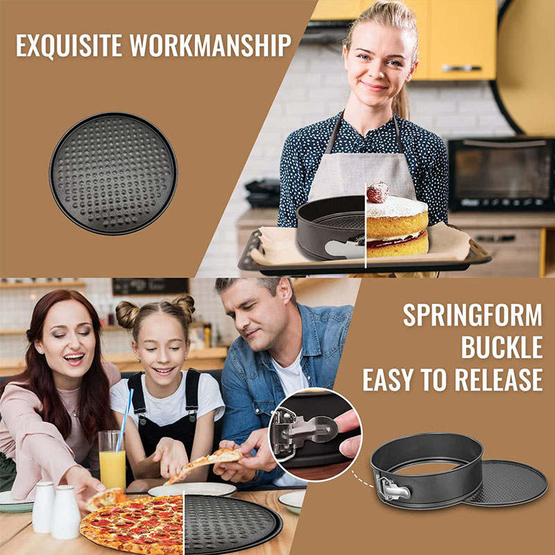 - Cake pans sets for baking with a spring latch on the side, it is easy to open and close the detachable pan collar, easily take off your elaborate cake from the cake pan. The cheesecake pans have removable bottom, which can help you easily demold.The food can be baked safely and presents a perfect look.