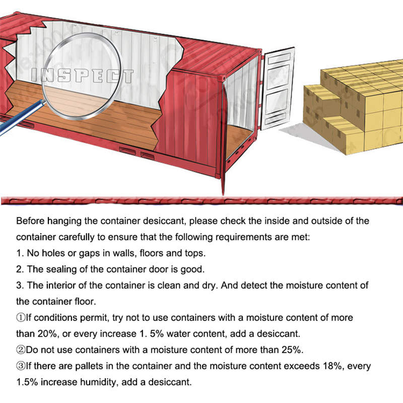 - Large-capacity dehumidification packs are very suitable for containers and warehouses in confined spaces. 4-6 dehumidification packs are recommended for 20¡± containers, and 10-12 dehumidification packs are recommended for 40¡± containers.