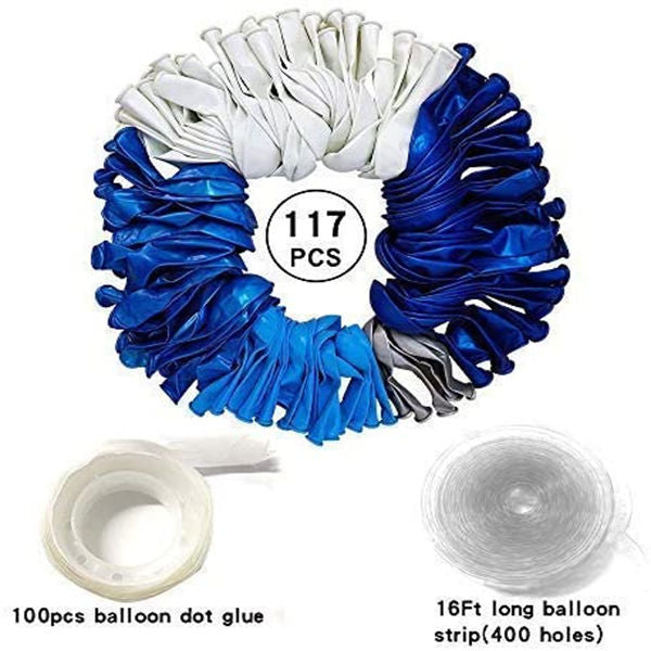 - Blue balloon garland kit: 117 blue and white balloon garland kits- 10 inch pearlescent dark blue latex balloon*30, 10 inch pearlescent light blue latex balloon*30, 10 inch white latex balloon*30, 5 inch blue latex balloon*20, 5 inch silver metal balloon*5, Balloon chain*1, 100 dots *1