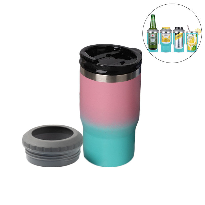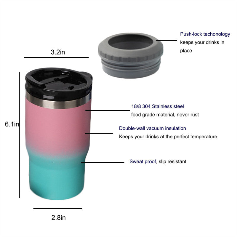 - Easy to Use: This 4 in 1 insulated can cooler couldn't be easier to use. Just twist off the grey ring, drop in your favorite chilled beverage, twist the grey ring back on, and enjoy! Or pour your beverage in and snap on the lid for a ready-to-go tumbler. It's dishwasher safe and cup holder friendly.