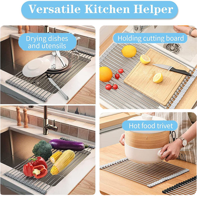 - Multipurpose: The folding sink dish drainer can not only be used as a drainer for air drying kitchen utensils, such as dish washing, pans, glasses; it can also be used as a vegetable colander for fruit and vegetable washing; or as a work bench Non-slip trivet for hot pans or griddles. This dish drying mat can also be used as a kitchen sink rack, sink cover, camping sink mat, sponge holder, fruit hammock, sink funnel, kitchen sink organizer and RV storage.