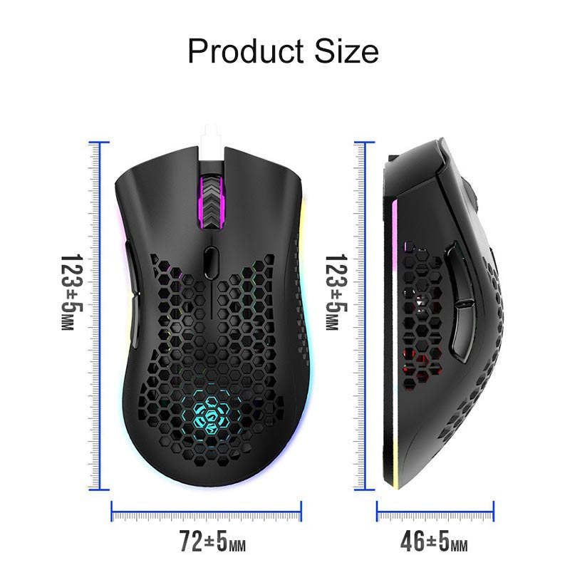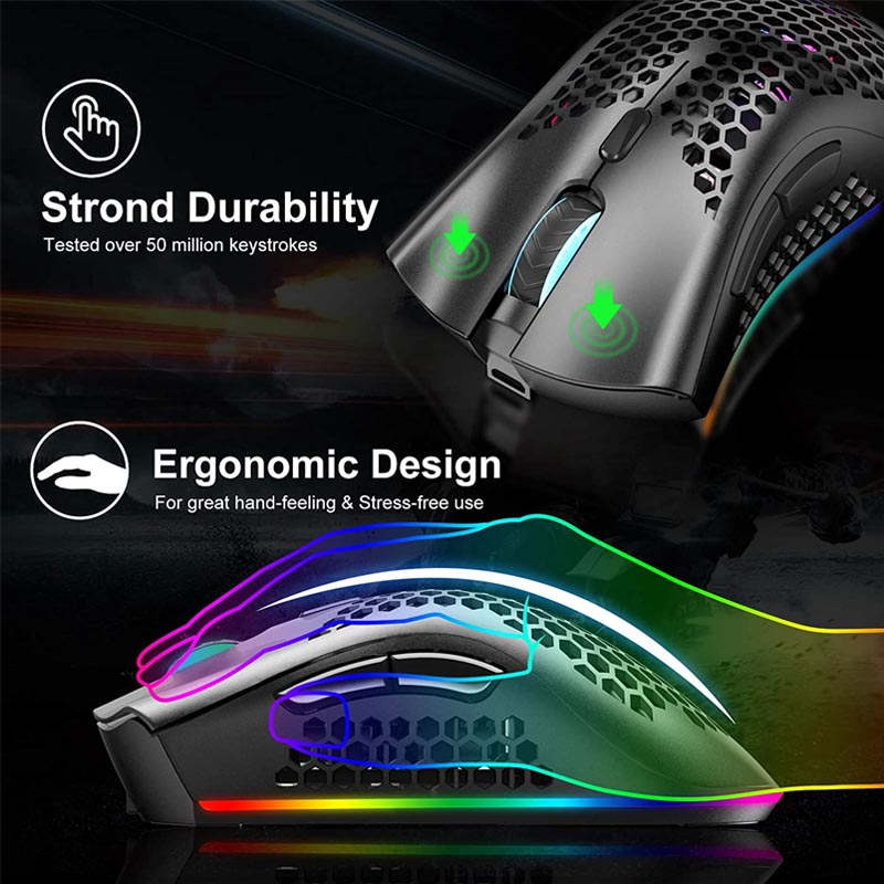 - Ultra Light Honeycomb Wireless Gaming Mouse: The well-designed ergonomic hollow perforated shell, brings you the most extreme gaming experience. Reduces weight, improves heat dissipation, they provide ventilation to keep your palms cool and fresh. Assures your long-session gaming without fatigue.