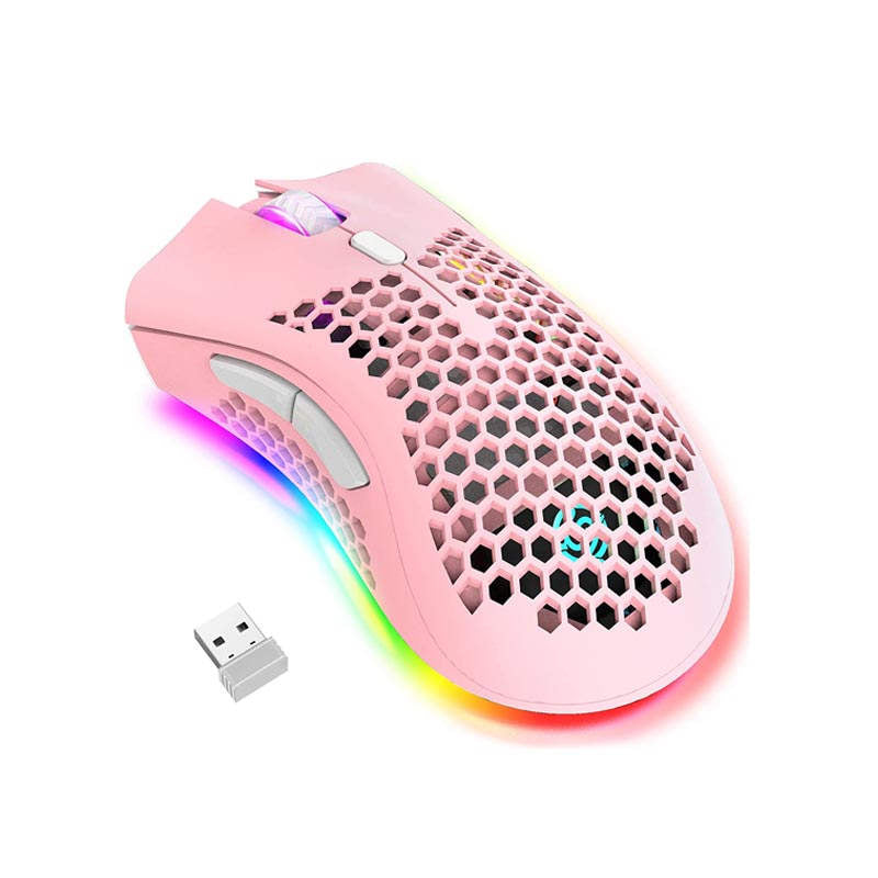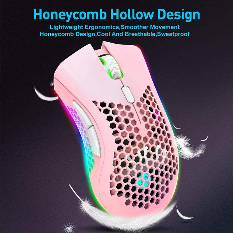 - Ultra Light Honeycomb Wireless Gaming Mouse: The well-designed ergonomic hollow perforated shell, brings you the most extreme gaming experience. Reduces weight, improves heat dissipation, they provide ventilation to keep your palms cool and fresh. Assures your long-session gaming without fatigue.