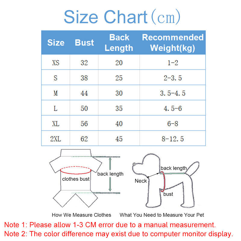 - Note 3: The recommended size of this clothes is 2-3cm larger than that of the dog.