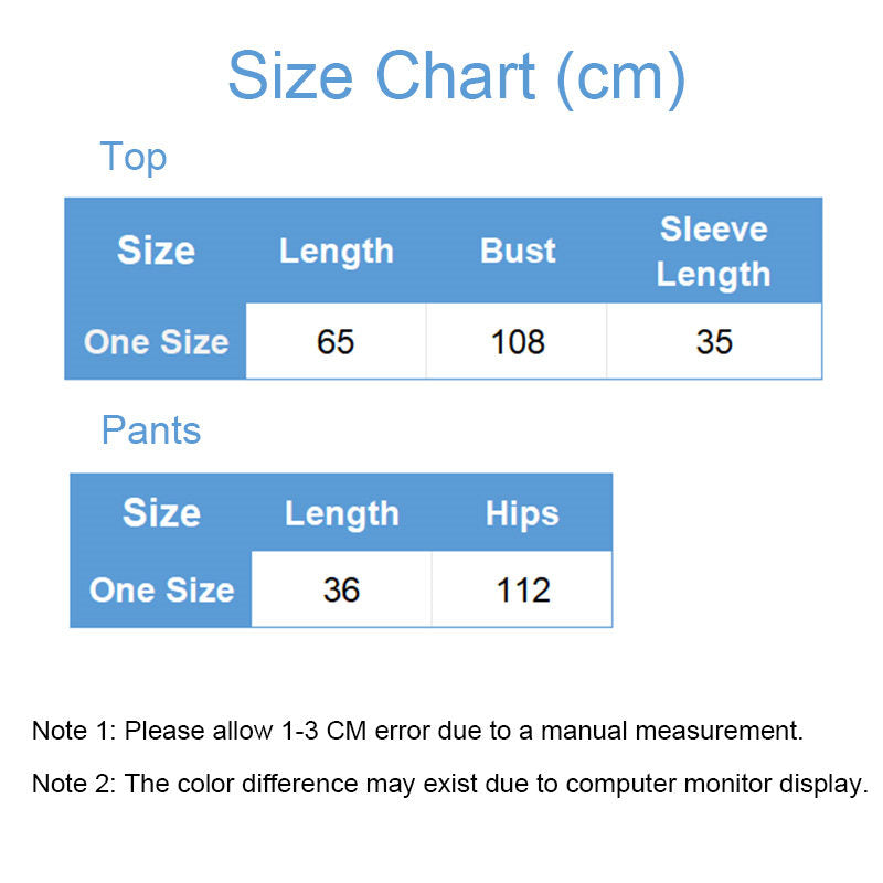 - One Size: Top: Length 65cm, Bust: 108cm, Sleeve length: 35cm; Pants: Length 36cm, Hips: 112cm