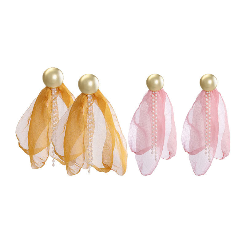 - These flower drop earrings feature pearl tassels that extend the curves of the face. Flower drop earrings feature long four petals and long pearl fringes.