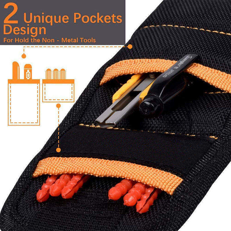 - 20 Upgraded stronger magnets: The magnetic wristband upgraded from 15 ordinary magnets to 20 stronger magnets, much more powerful than the similar magnetic belt. A powerful wrist magnet surrounds the almost entire wrist for holding screws, nails, drill bits, fasteners.
