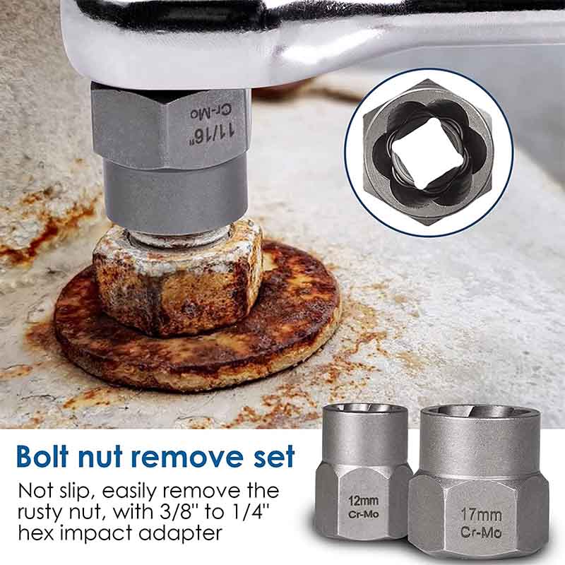 - 26PCS Screw&Bolt Extractor Set: This is a set of saved your lots of time and frustration, 3-in-1 screw & bolt extractor sets and drill bit kits.Package including: 13PCS Nut Remover Set: 1/4", 5/16"(8mm), 3/8", 10mm, 7/16"(11mm), 12mm, 1/2", 13mm, 9/16"(14mm), 5/8"(16mm), 17mm, 11/16", 3/4"(19mm); 6PCS HSS Cobalt Drill Bits: 3/8", 9/32", 1/4", 5/32", 1/8", 3/32"; 6PCS Spiral Screw Extractors: #1, #2, #3, #4, #5, #6; 1PCS 3/8"-1/4" Hex Adapter.