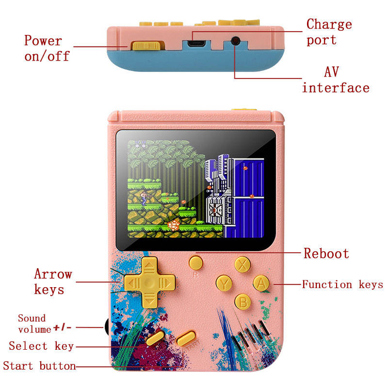Portable Classic Game Console built-in 1020 mAh Rechargeable lithium battery. The mini game console comes with USB cable, charging time is about 1~3 hours, 2~3 hours of continuous game play. which is ideal for frequent business trips, travel, travel, camping. Never worry about running out of battery again.
