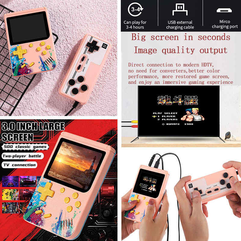 500 classic games are built into this mini retro handheld game console. The classic FC game lets you play 500 games without any ads or extra costs, including arcade retro, puzzle, arcade, shooter, racing, fighting, adventure and more. Each game is a classic of your childhood. More game options, recall fond childhood memories, play fun game time with kids or friends, and take a break from free time.