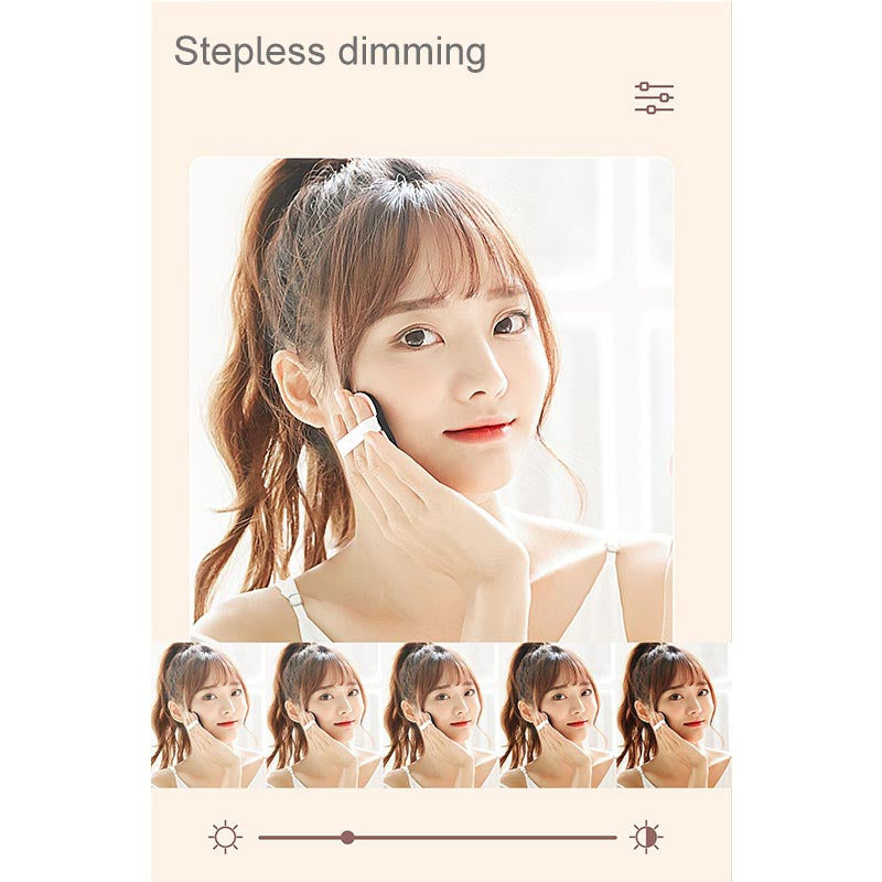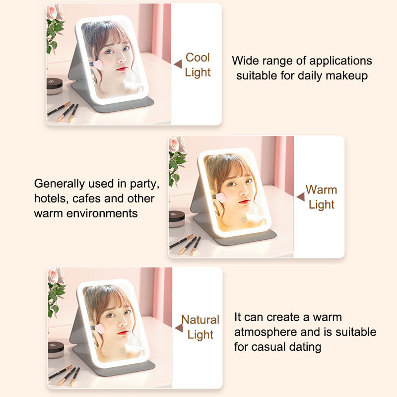 - 3 Colors Touch Screen Lighted Mirror: Compare with the traditional makeup mirrors,We've done upgrades in power and functionality.Our travel mirror with LED lights has 3 color lights and Touch Screen Stepless Dimming functions.Lighting color modes and brightness both control by the touch screen switch.Double touch the switch to select 3 color lighting modes:white lights,warm lights and natural lights,and just long press to dim or bright the led lights between 100%,50% and 10% brightness.