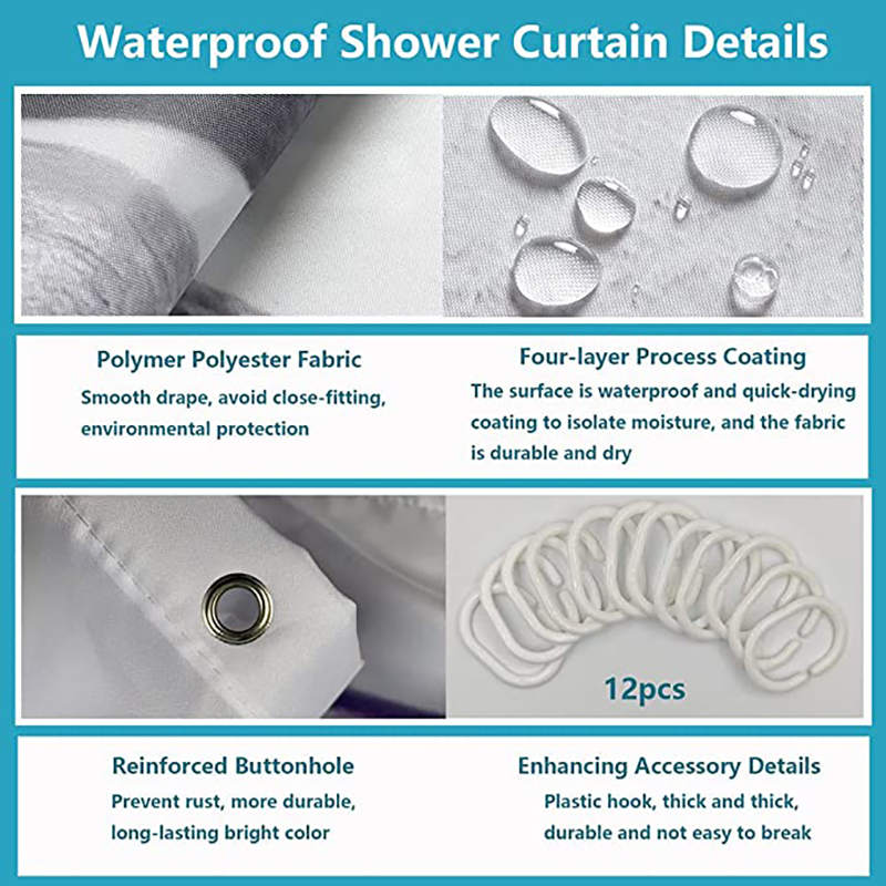 - High-quality materials: This shower curtain uses high-quality polyester fabric, non-toxic, odorless, environmentally friendly, waterproof and moisture-proof, dry and wet, and inhibit the growth of bacteria.