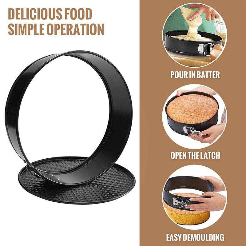 - Cake pans sets for baking with a spring latch on the side, it is easy to open and close the detachable pan collar, easily take off your elaborate cake from the cake pan. The cheesecake pans have removable bottom, which can help you easily demold.The food can be baked safely and presents a perfect look.