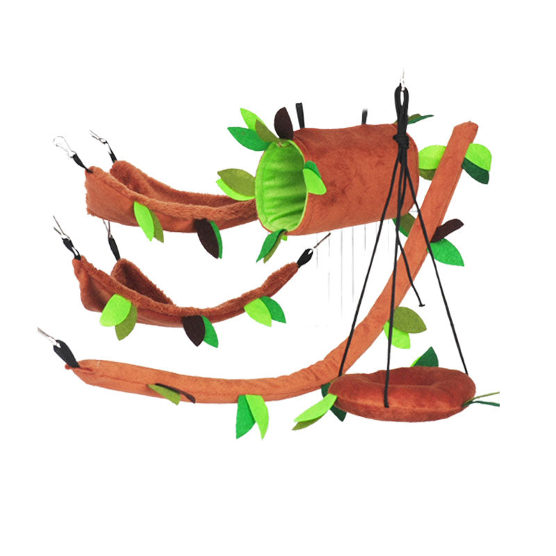 - 5 pcs (2 hammocks+ 1 channel+ 1 swing+ 1 ropeway). Your little pet can hide and seek, exercise, sleep, play, and rest. Let these little toys accompany your pet to grow up healthy.