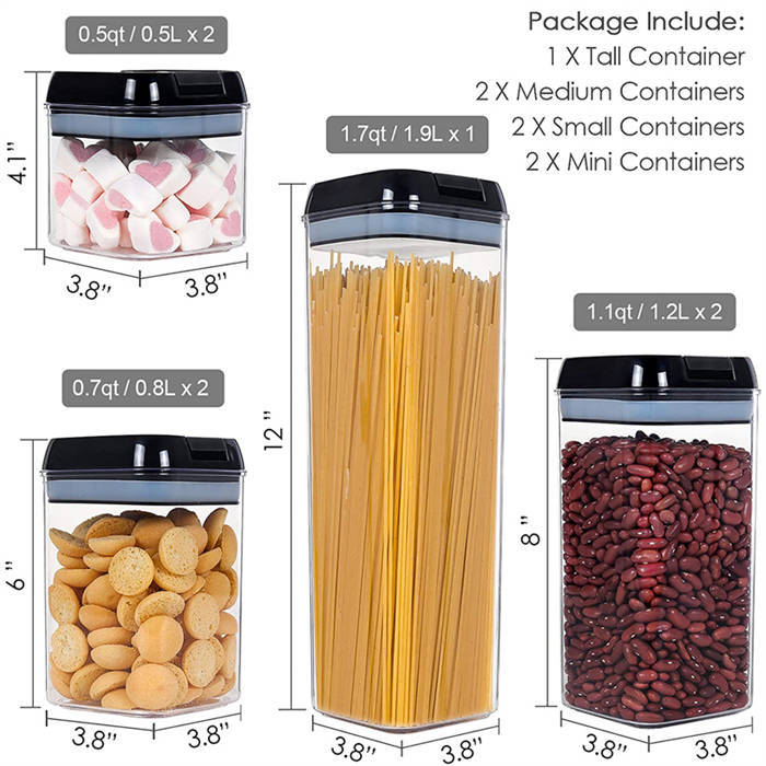 - One Set Include 7 Pieces Containers----1 Tall Container (1.7qt ), 2 Medium Containers (1.1qt ), 2 Small Containers (0.7qt), 2 Mini Containers (0.5qt). Perfect for storing flour, sugar, rice, grain, nuts, beans, snacks, pasta, coffee and tea!