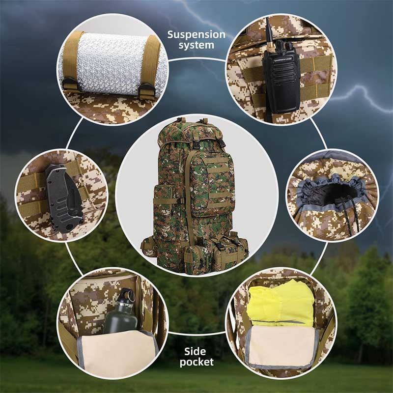- Military Backpack: The camping military rucksack is made of 600D oxford cloth fabric and polyester and waterproof material,wear resistant,tear resistant,anti-Scratch.This military tactical backpack bags with strong hanging system to carry more items.