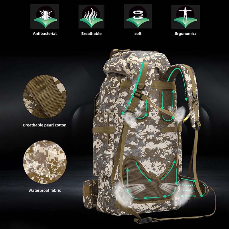 - Thickened Waterproof Fabric & Breathable Sponge Straps: Our 80L tactical backpack for hiking use upgraded thickened waterproof fabric and breathable mesh shoulder straps for tactical backpacks, sponge padding is more tough durable and comfortable than traditional mens hiking backpack. Waterproof military backpack. This military backpack for men shoulder straps is adjustablea, you could adjust the tightness according to your need.