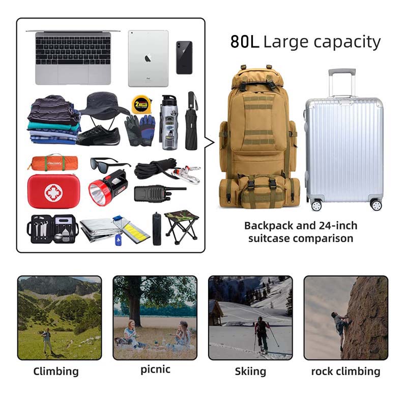 - Large-Capacity Hiking 80L Hiking backpack , large-capacity main pocket + 4 large external hanging.the main hiking bag can hold clothes, quilts,travel items,sleeping bags.the camping rucksack 80l can hold 2-3 people travel equipment. Four external hanging systems can be used to tie tents, moisture-proof mats + trekking poles + tie sleeping mats, picnic mats,etc.