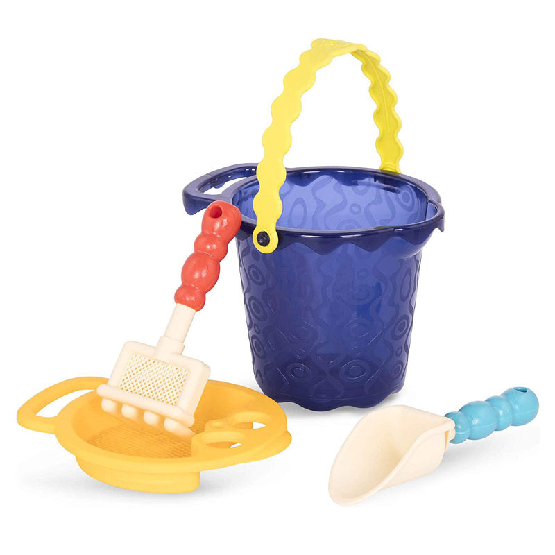 - Grab this colorful toy bucket and you're all set! The navy blue beach toy set contains 9 funky and colorful beach toys, all in one convenient bucket. Sturdy handle for easy storage and portability.