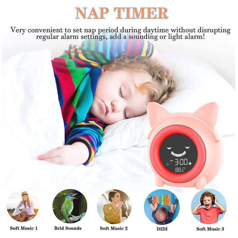 - Multifunction Alarm Clocks For Kids: In addition to being a clock, Little Noah can also provide a standard alarm clock, wake up/sleep clock and 10-min snooze. Kids clock can also be used as a nap timer or activity timer for bathtime and playtime as well as bedtime - choose a nap timer from 10 minutes up to 3 hours, and select either a alarm ringtones or a red light for the 'time's up' signal.