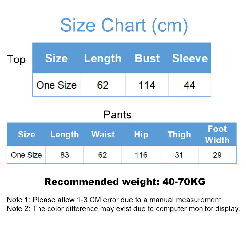 - One Size: Fits weight 40-70 kg.Top: Length 62cm, Bust: 114cm, Sleeve length: 44cm; Pants: Length 87cm, Waist: 62cm, Hips: 108cm