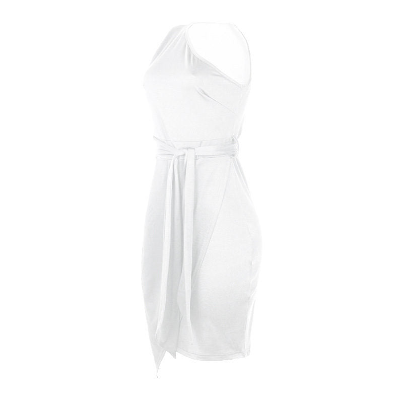 Solid Color Sleeveless Sloping Shoulder Strap Party Cocktail Dress-White