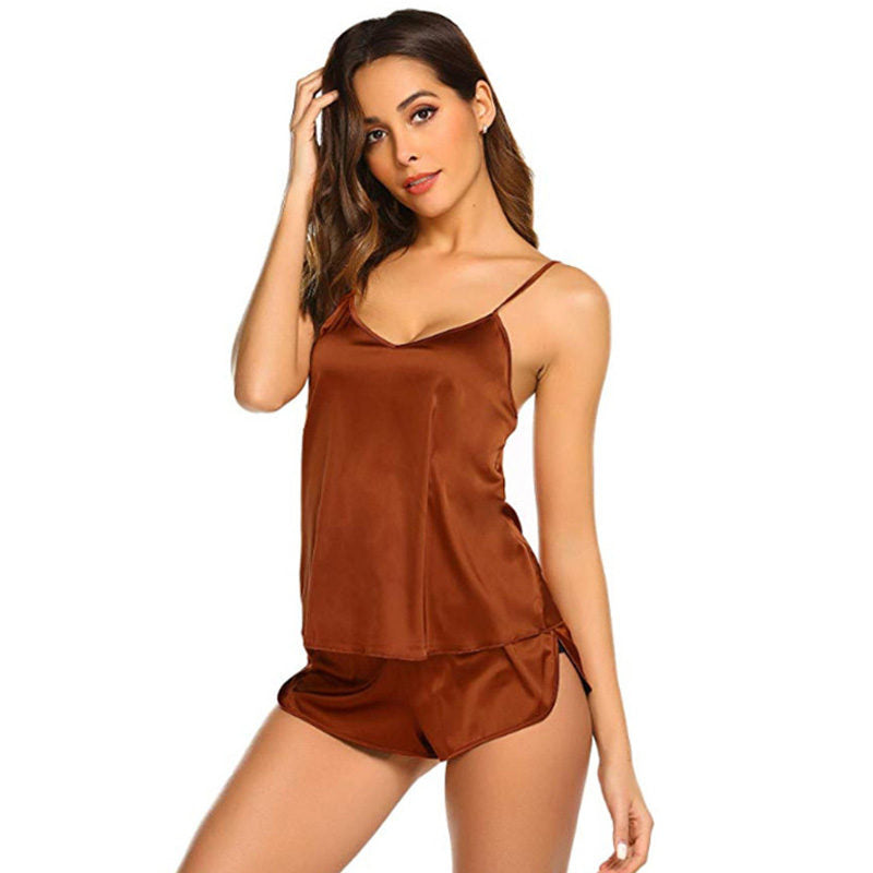 Women Sexy Satin V Neck Camisole Shorts Pajamas Set-Coffee