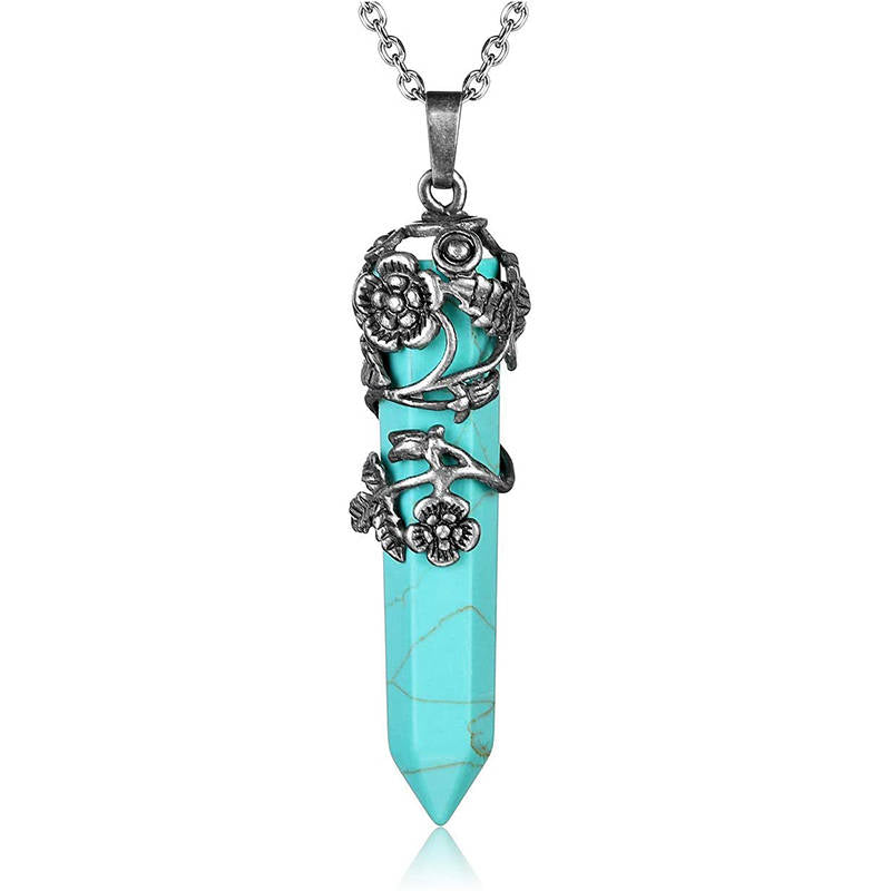 Antique Silver Flower Wrapped Crystal Necklace-Turquoise