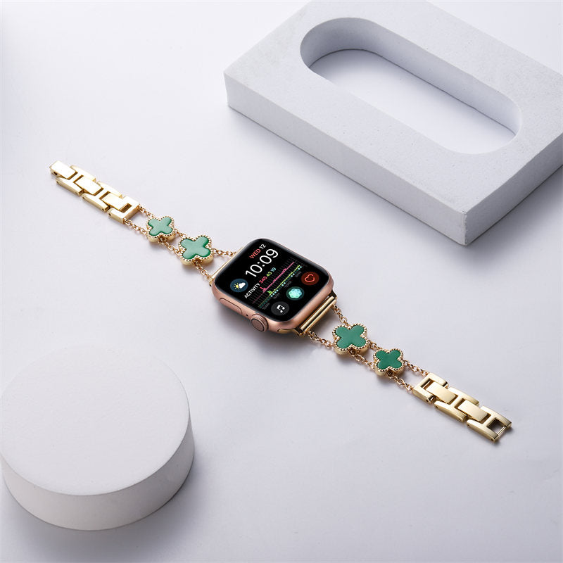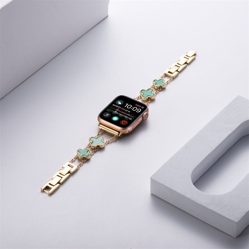 Apple Watch Band Luxury Four-leaf Clover Thin Stainless Steel for iWatch Series SE/6/5/4/3/2/1-Gold+Green