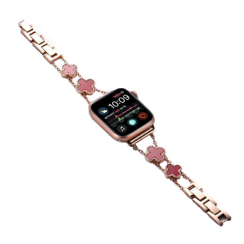 Apple Watch Band Luxury Four-leaf Clover Thin Stainless Steel for iWatch Series SE/6/5/4/3/2/1-RoseGold+Pink