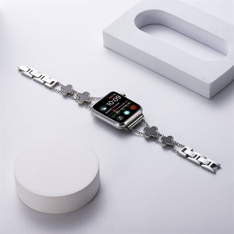 Apple Watch Band Luxury Four-leaf Clover Thin Stainless Steel for iWatch Series SE/6/5/4/3/2/1-Silver+Black