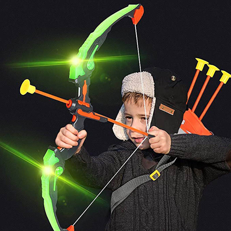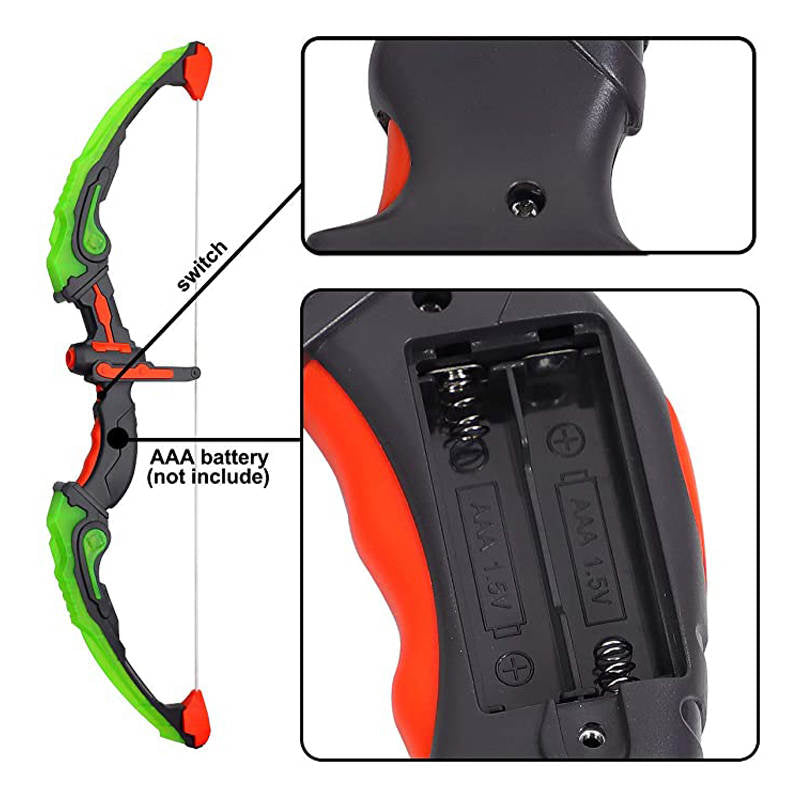 - A more attractive outdoor toy: archery bow with LED flash. The LED flash in the toy bow will illuminate when shooting the target, so that the position of the arrow can be easily tracked at night.