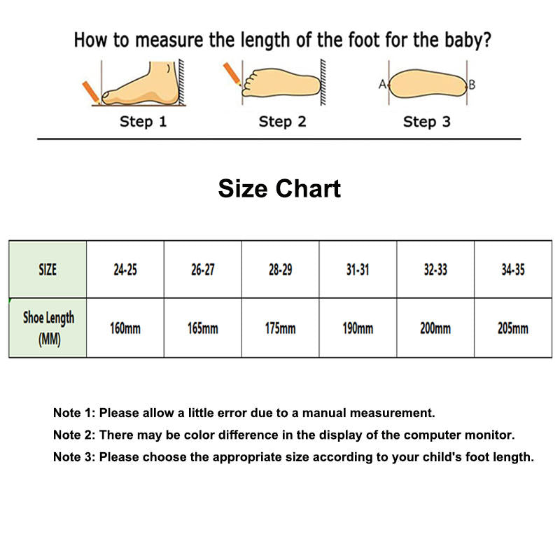 - Reminder: Please refer to the shoe size chart in the picture before buying shoes to get the correct size. Since the dimensions are manually measured, there may be some errors. Please measure the length of your child's feet to get the best fit. Due to the different display and lighting effects of the monitor, the picture may not reflect the actual color.