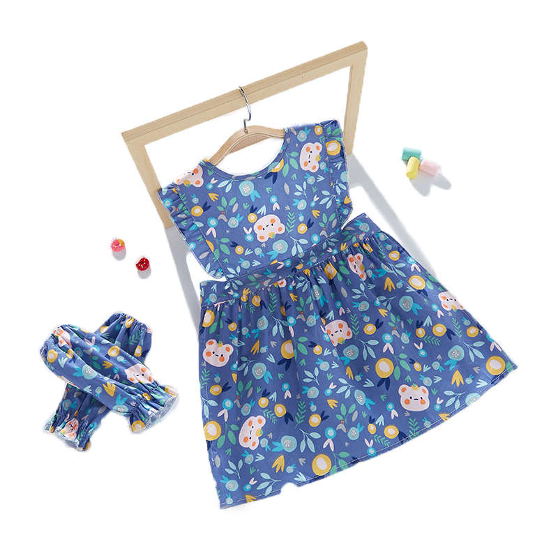 Baby Girl Waterproof Dress Bibs With 2 sleeves Covers-Blue Flower Bear