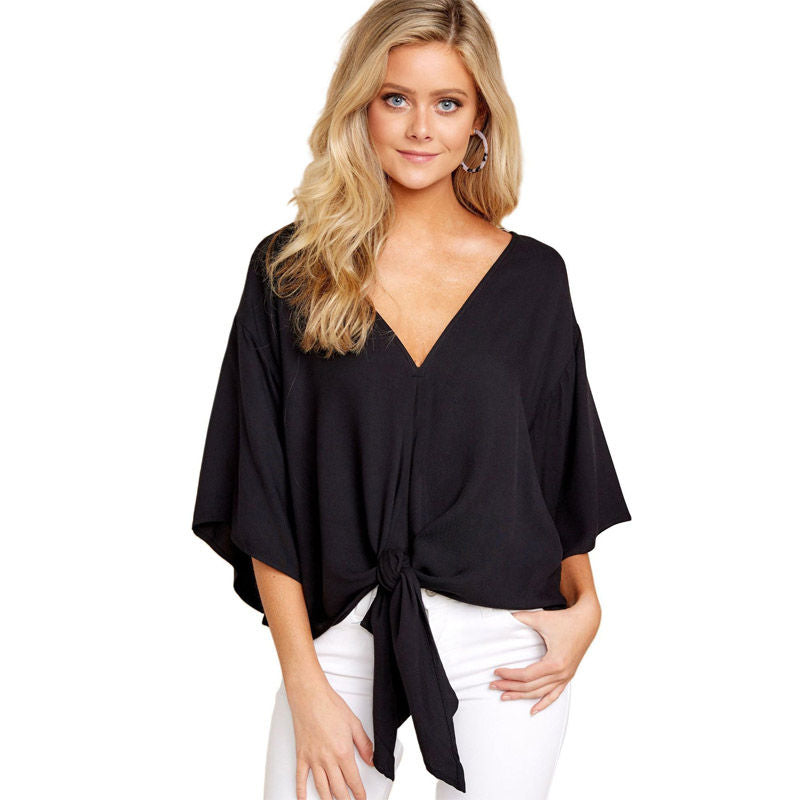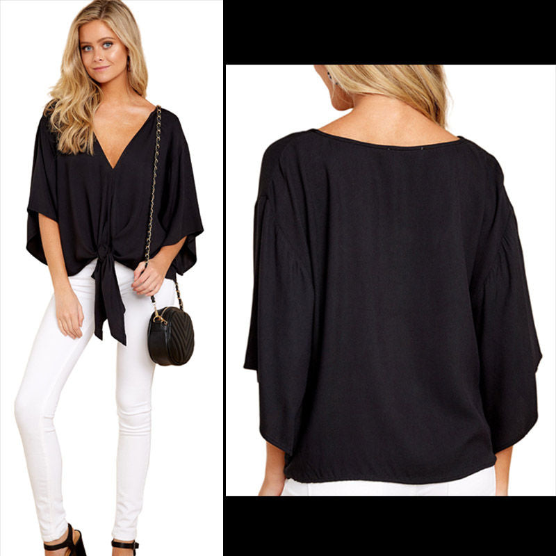 Boho Womens Blouse V Neck Tie Knot 3/4 Sleeve Summer Casual Tops-Black