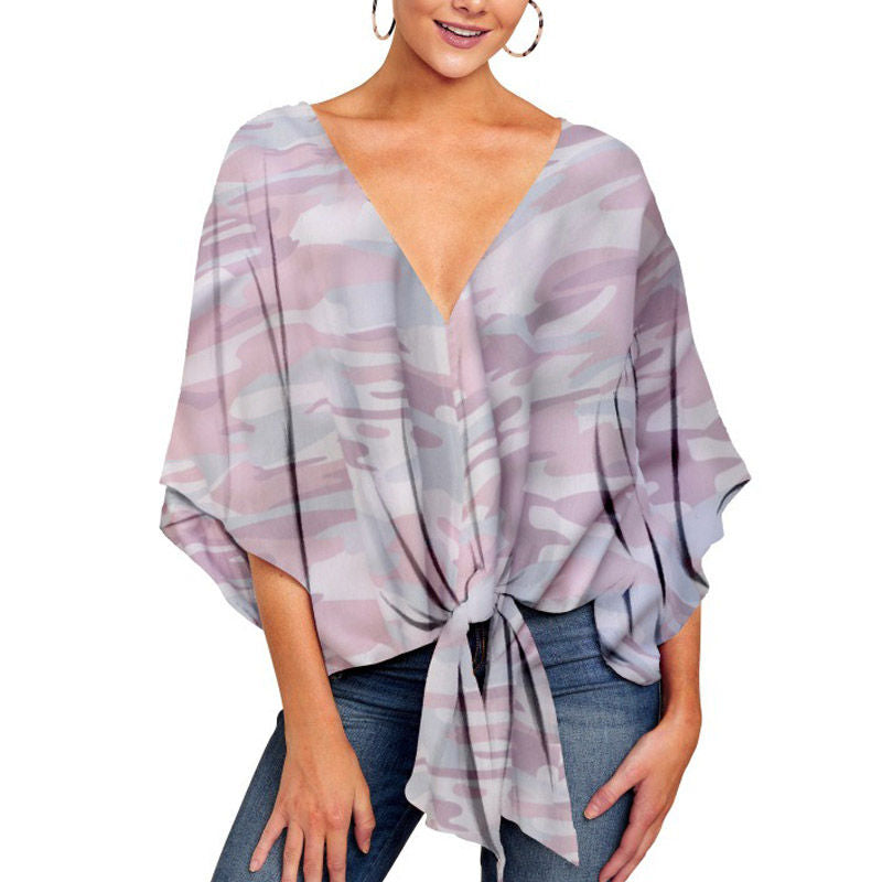 Boho Womens Blouse V Neck Tie Knot 3/4 Sleeve Summer Casual Tops-Camouflage