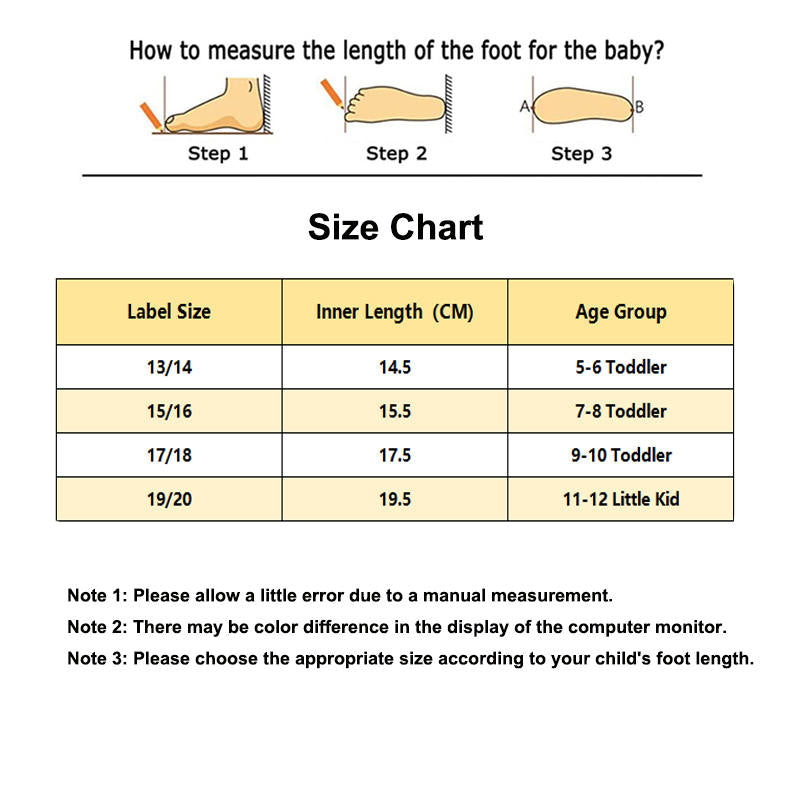 - Please refer to the shoe size chart in the picture before buying shoes to get the correct size. Since the dimensions are manually measured, there may be some errors. Please measure the length of your child's feet to get the best fit. Due to the different display and lighting effects of the monitor, the picture may not reflect the actual color.