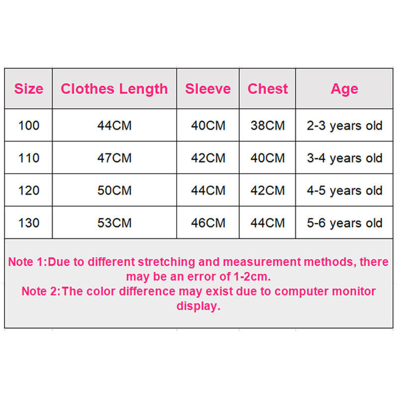 - Size: 100 is suitable for 2-3 years old; 110 is suitable for 3-4 years old; 120 is suitable for 4-5 years old; 130 is suitable for 5-6 years old. There is a 1-2cm error in manual measurement, which is for reference only. The color difference may exist due to computer monitor display.