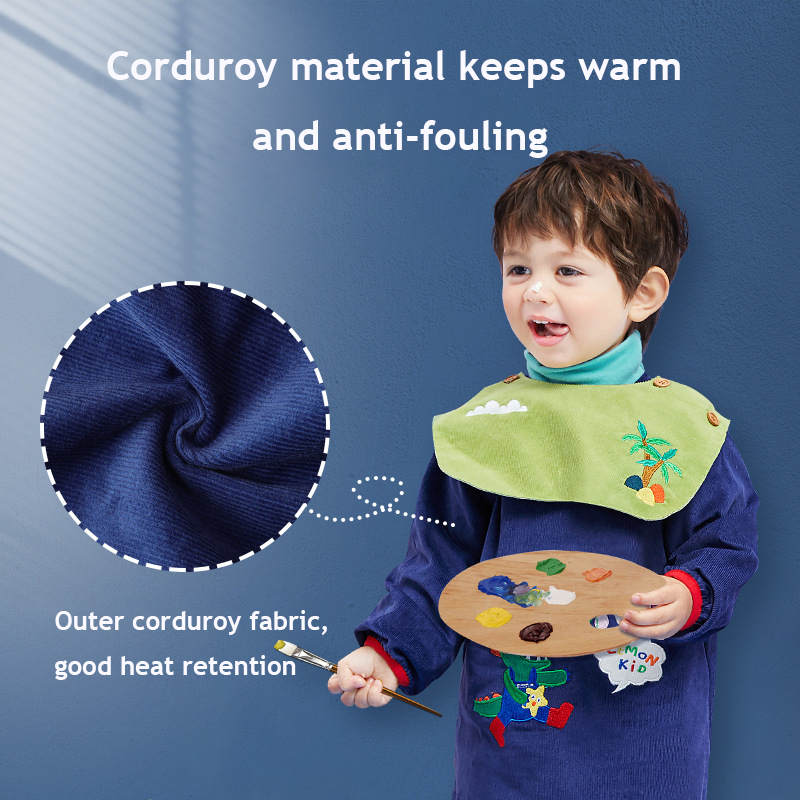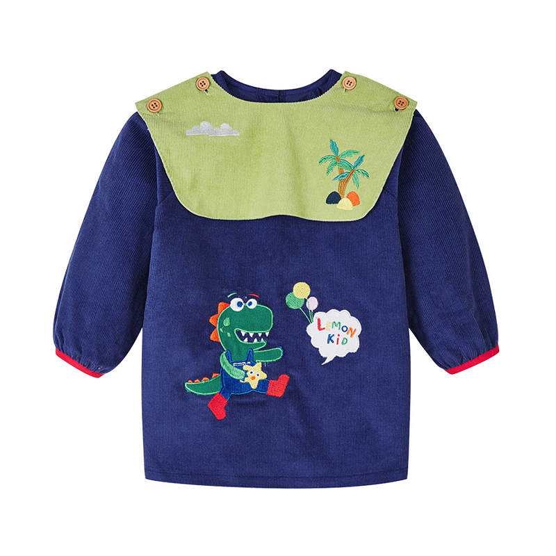Cartoon Kids Corduroy Smock Detachable Bib for Drawing Cooking-Navy Blue Dinosaur