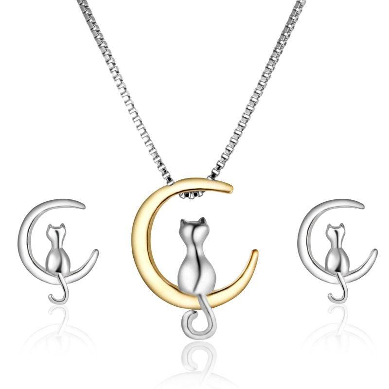 Cat Moon Studs Earrings + Necklace Set Lovers Gift for Women