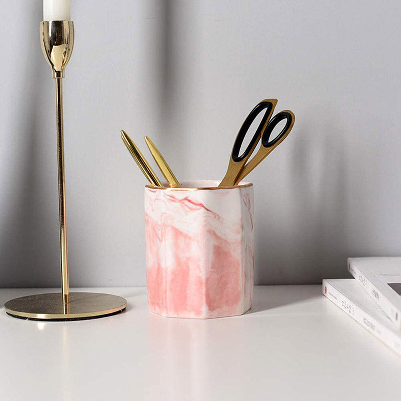 Ceramic Desk Pen Holder Stand Marble Pattern Pencil Cup Pot Desk Organizer Makeup Brush Holder -Pink