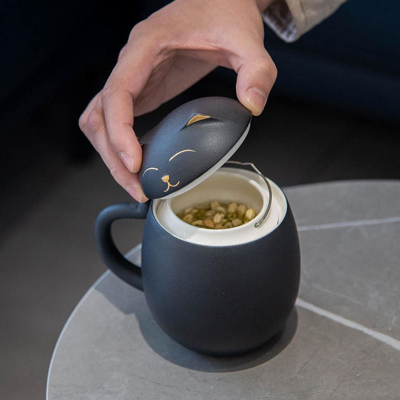 Ceramic Tea Mug 350ML with Infuser and Lid Cute Cat Cup for Home Office-Black