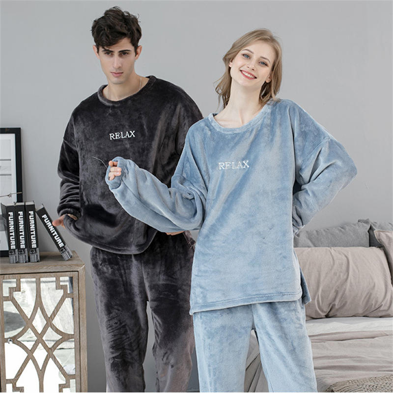 Crew Neck Flannel Pajamas Set for Women-Haze Blue