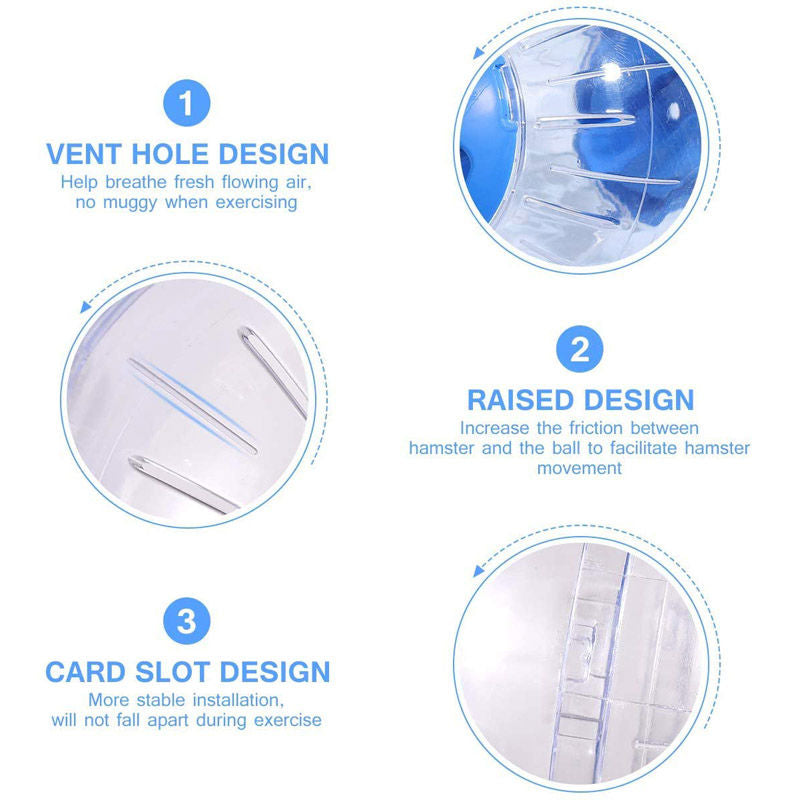 - With snap-button design, through the air outlet, the ball friction and air circulation are increased, pets will not get hot or feel hard to breathe, and keep it inside for a long time. Its transparent design allows you to clearly see when your hamster is exercising. You can play with your pets for more fun.