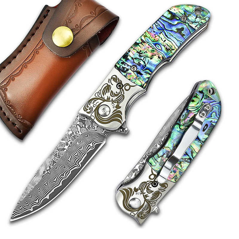 - Abalone Scales Handle: Damascus pocket knife is 169mm overall length, 72mm blade length. Ergonomic handle covered with bright abalone seashells and resin. It's under thick resin, so it can't crack and fall apart. Comfortable operation, beautiful appearance, worth more than the price paid.