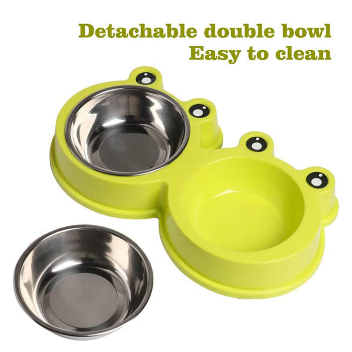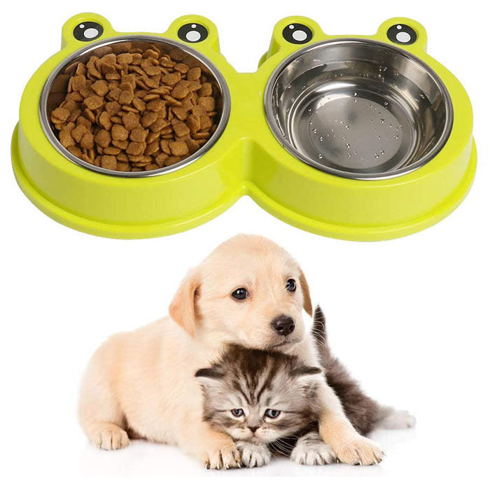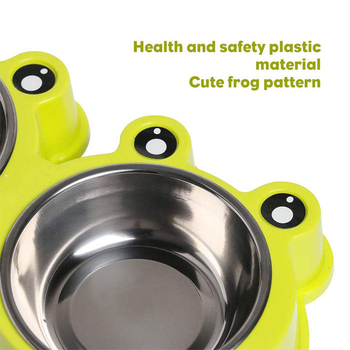 - Our pet bowls has double stainless steel bowls, one for food and the other for water, your dog or cat will be attracted by this flog shape bowls, it will make more fun while eating and drinking.
