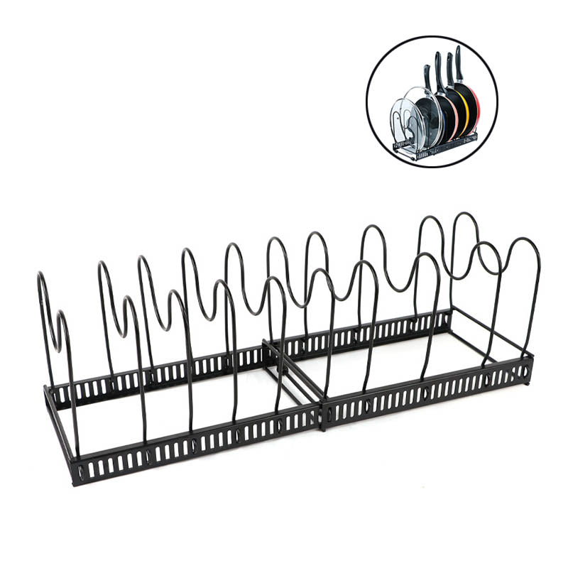 - U-shaped Divider: U-shaped groove design, so that the lid and pot can be placed stably and easy to take. Our extensible pan organizer is equipped with 10 pot rack dividers. You can adjust and install the divider according to the size of the pots and pans or other kitchen utensils at home.