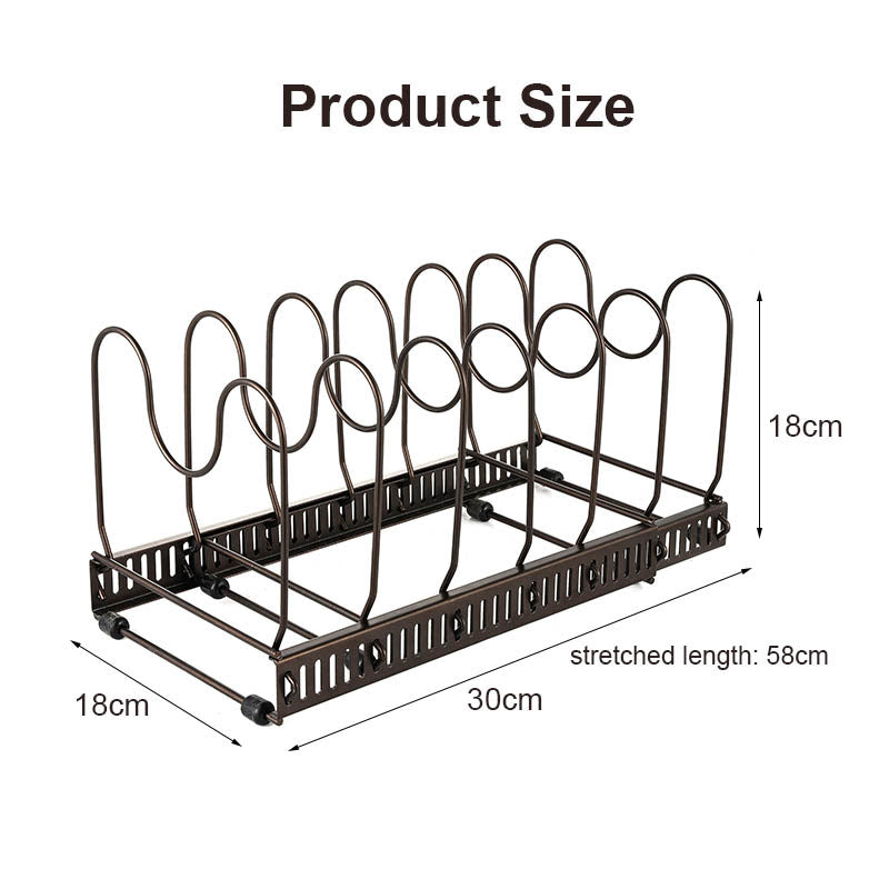- U-shaped Divider: U-shaped groove design, so that the lid and pot can be placed stably and easy to take. Our extensible pan organizer is equipped with 10 pot rack dividers. You can adjust and install the divider according to the size of the pots and pans or other kitchen utensils at home.