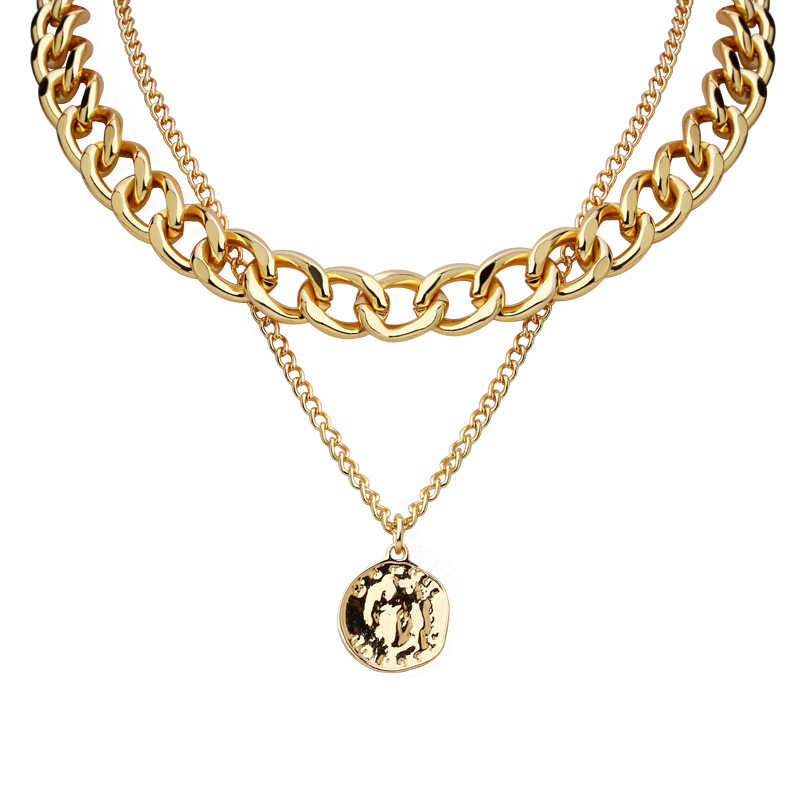 - With gold thick chain and delicate gold chain, layered design with coin pendant, we are fascinated.