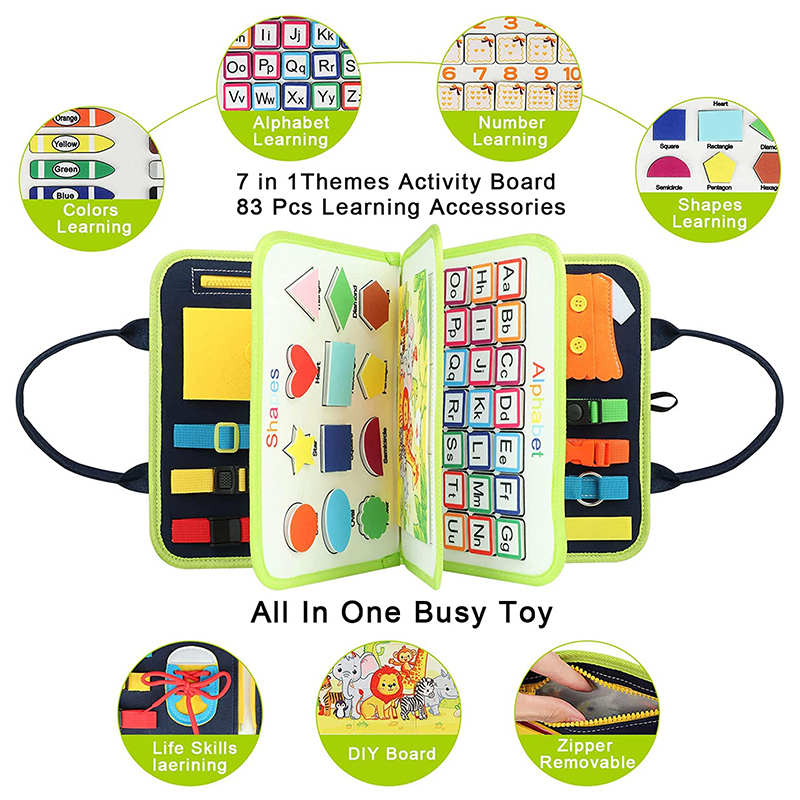- Advanced Design Concept and The Emphasis on Children Experience. Use Busy Book Design So That Children Can Flip Book to Provide A Richer Preschool Learning Activities. Lightweight and compact busy board with a handle, portable for toddlers to carry.